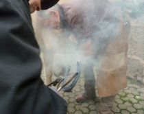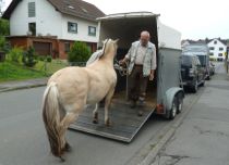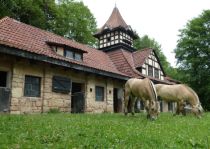 02. Juli 20114. Pausentag. Wir genießen Hotel Hohenhaus mit Schwimmbad, Sauna und Sternekoch! Spaziergang mit den Pferden, Kirschenessen vom Baum. Die Pferde erholen sich bei bestem Futter und netten Stallkollegen (Schafen und Hühnern). Spoony will unbedingt ins Schwimmbad - ist uns zu riskant! 03. Juli 2011In der Früh regnet es heftig. Nochmal köstliches Frühstück, dann geht es in Regenmänteln los. Herrliche Waldwege, aber es pfeift ein eiskalter Wind und es nieselt dauernd. Ganz schön hart. Immerhin können wir in Reichensachsen ohne Regen die Pferde anbinden und gemütlich ins Gasthaus gehen. Nicht mehr weit zu den Züchterfreunden Edith und Manfred Stange in Berkatal. Aber am Ende verreiten wir uns nochmal heftig und kommen ziemlich kaputt um 19.30 Uhr an. 04. Juli 2011Manfred hat uns einen Termin beim Schmied organisiert. Alle acht Hufe werden komplett neu beschlagen. Wolfgang und der Schmied sind in voller Aktion, Manfred und Roland helfen, halten, schuften. Dann kommt Heinrich Müller, alter Reiterfreund aus Hessen an, der uns die nächsten Tage mit seinem Fjordwallach Benno begleiten wird. Spoony läuft zu Hochtouren auf, bringt die Hufnägel und das kleine Werkzeug ... Um 12 Uhr kommen wir los, haben " nur" noch ca. 25 Kilometer für diesen Tag. Doch wieder gibt es Probleme im dunklen Wald an der alten innerdeutschen Grenze. GPS, Kartelesen und steile Irrwege - plötzlich stehen wir vor Burg Hanstein, von der uns eine extrem steile Schlucht (die alte Grenze) trennt. Senkrecht runter - senkrecht rauf und endlich erreichen wir wieder einmal rührend nette Pferdeleute in Hebenshausen. |
